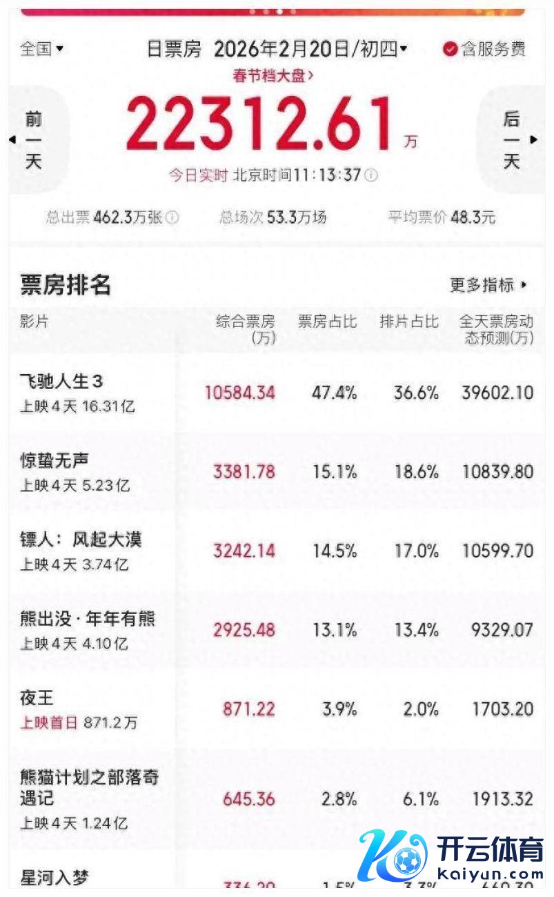 到大岁首四晚上十二点 《飞奔东说念主生》票房曾经冲到17.8亿 排第二的片子独一4.9亿 连它的三分之一都不到,第三名更独一2.7亿。。首日4.62亿,这个数字径直进了春节档历史前三;头三天周末加起来11.3亿,初四今日还能再收1.78亿,曾经连拿四天单日冠军。。排片从月吉的28%冉冉涨到初四的41%,黄金场次占比致使向上一半 原理是宇宙最佳的那些期间段 基本都在给沈腾闪开。。
