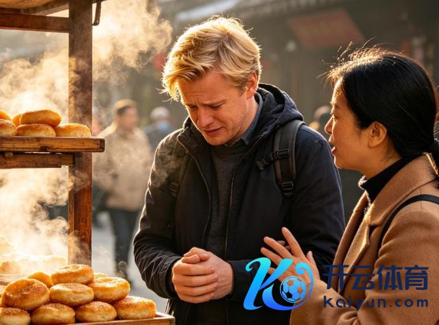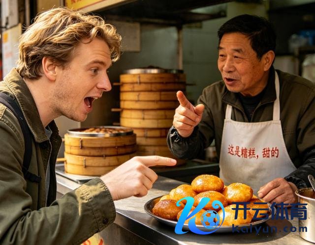 他指着糖糕说英文,手不竭比划,能够是问价钱、思买几个,我笑着用生硬的往常话加手势告诉他:“一块钱两个,刚炸好的,热乎的。”