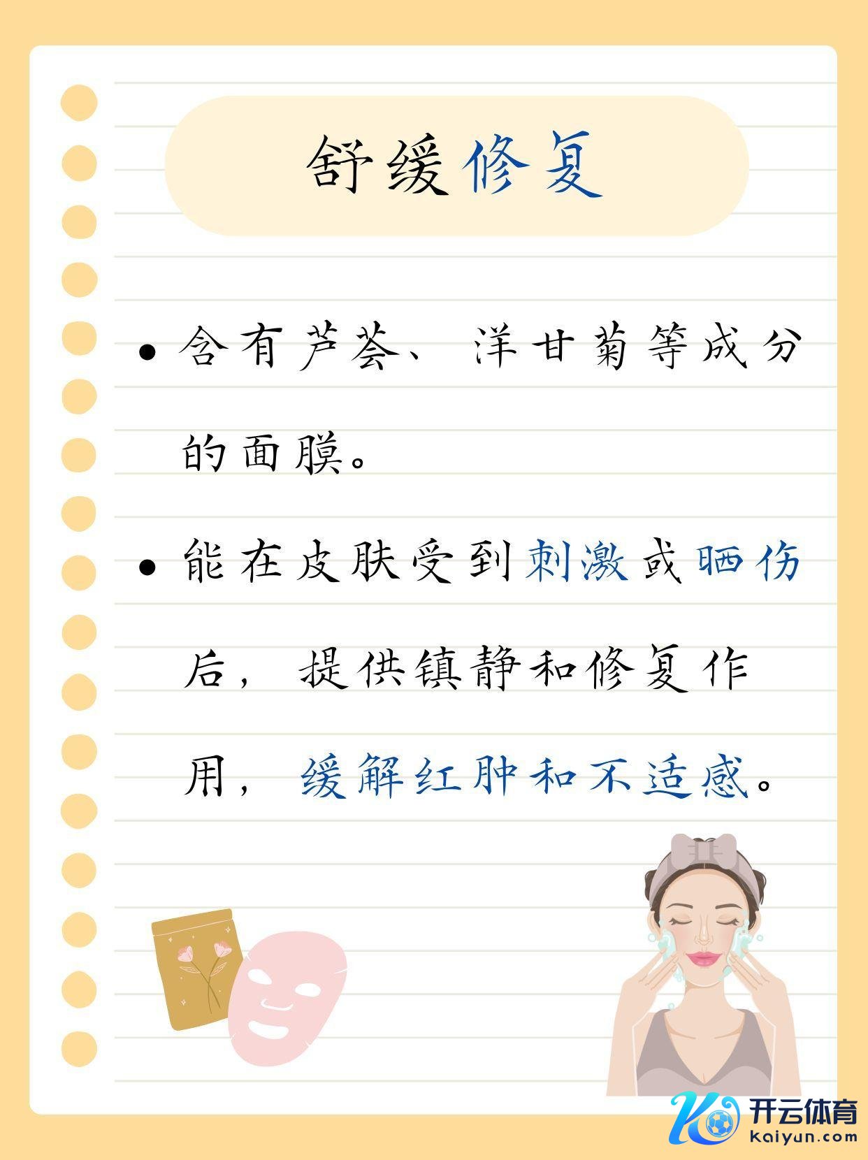 某些面膜含有舒徐身分,如芦荟、洋甘菊等,能在皮肤受到刺激或晒伤后,提供沉着和开辟作用,缓解红肿和不适感。