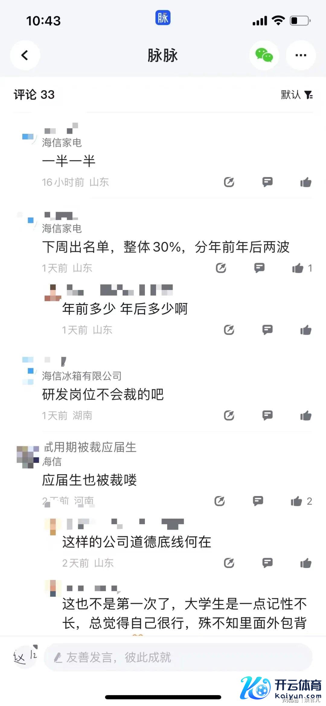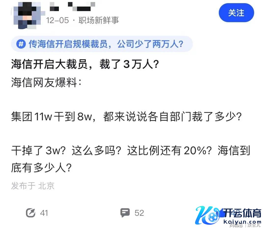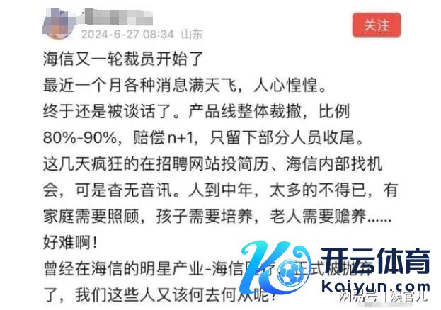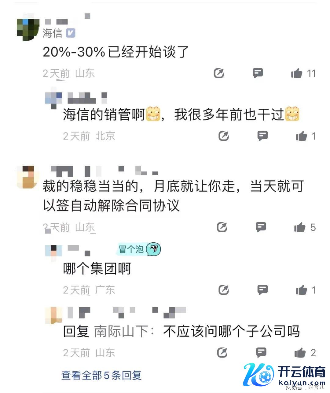 有认证为海信家电赴任的网友在酬酢平台线路,“一半一半,下周会出名单,合座30%,分年前和年后两波”、“裁人3万据说”。更有网友爆料称2024届应届生刚加入海信半年就签了下野左券。“这次裁的主要便是实习生和老职工。”有网友线路。