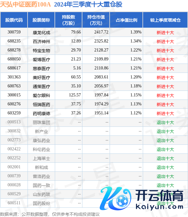 天弘中证医药100A为指数型-股票基金,凭证最新一期基金季报披露,该基金金钱树立:股票占净值比95.33%,债券占净值比0.19%,现款占净值比4.86%。基金十大重仓股如下: