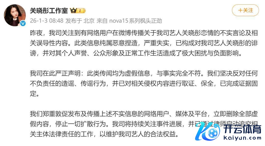 昨夜,我司关心到有收集用户在微博传播对于我司艺东说念主关晓彤恋情的乌有言论及关连误导性实质。此类信息练习坏心握造,严重无理,已组成对我司艺东说念主关晓彤的贬抑,并对其个东说念主声誉、公众形象及平常责任糊口酿成了极大困扰与负面影响。我司在此严正声明:此类传说均为虚假信息,与事实齐全不符。咱们坚硬反对任何不负背负的训斥、传谣活动,并已对关连侵权实质进行取证、保全,已完成凭证固定。咱们精细敦促发布及传播上述乌有信息的收集用户、媒体及平台,立即删除全部虚假实质,罢手一切扩散活动。我司将赓续关苦衷件进展,并已通过讼师运行根究关连主体法律背负的责任,以保养我司艺东说念主的正当职权。特此声明。