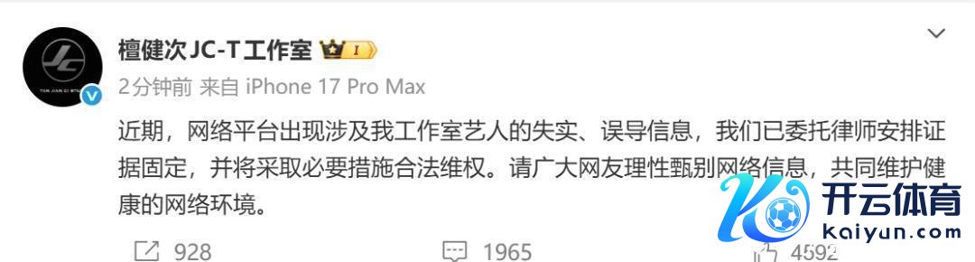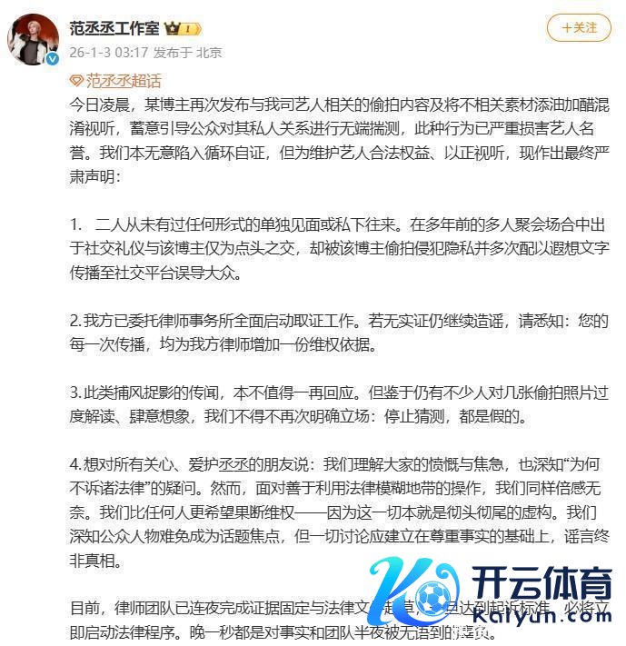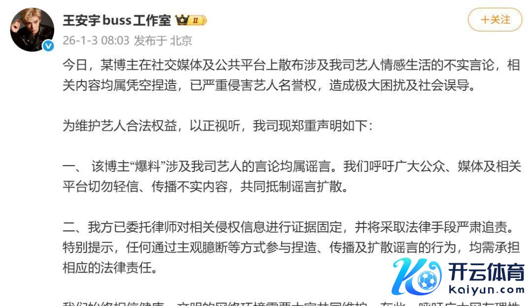 当天,某博主在酬酢媒体及全国平台上分散波及我司艺情面感糊口的乌有言论,关连实质均属造谣握造,已严重侵害艺东说念主名誉权,酿成极大困扰及社会误导。为保养艺东说念主正当职权,以正视听,我司现精细声明如下:一、 该博主“爆料”波及我司艺东说念主的言论均属流言。咱们号召雄伟公众、媒体及关连平台切勿轻信、传播乌有实质,共同阻抑流言扩散。二、本身已交付讼师对关连侵权信息进行凭证固定,并将聘请法律本领严肃追责。特别辅导,任何通过主不雅臆断等面孔参与握造、传播及扩散流言的活动,均需承担相应的法律背负。咱们恒久服气健康、端淑的收集环境需要巨匠共同保养。在此,号召雄伟网友感性分离信息,不训斥、不信谣、不传谣!