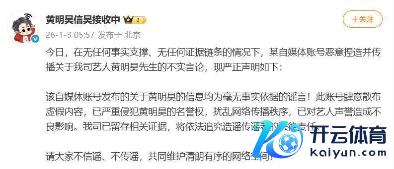 黄明昊责任室:“该自媒体账号发布的对于黄明昊的信息均为毫无事实依据的流言!我司已留存关连凭证,将照章根究训斥传谣者的法律背负。”