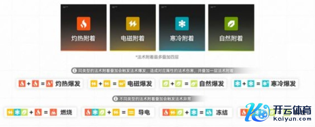 【法术极端】有四种属性:灼热、清冷、电磁、天然。单次法术极端只会给敌东谈主施加一层属性附着,两层同属性附着会产生一次法术爆炸,两层不同属性附着会酿成燃烧、冻结、导电、腐蚀,恶果顺次为陆续烧伤、冰冻规章、法术易伤、削减法抗。属性附着的层数越高,极端情状的伤害和恶果也就越高