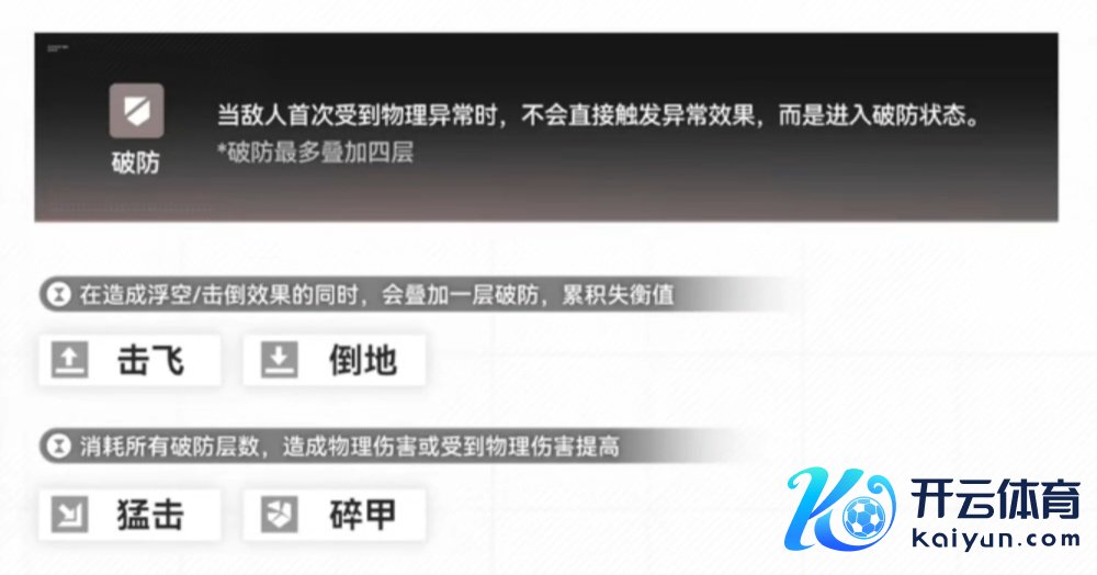 【物理极端】有四种样式:击飞、倒地、猛击、碎甲。敌东谈主初次受到物理极端袭击只会给他们添加破防层数,有了破防层数才智让物理极端情状成效。击飞和倒地只可规章袖珍敌东谈主,但会给系数被射中的敌东谈主额外添加一层破防并削韧。猛击和碎甲会消耗敌东谈主身上的系数破防层数,消耗层数越多,恶果越强。猛击是高倍率伤害,碎甲是施加物理易伤