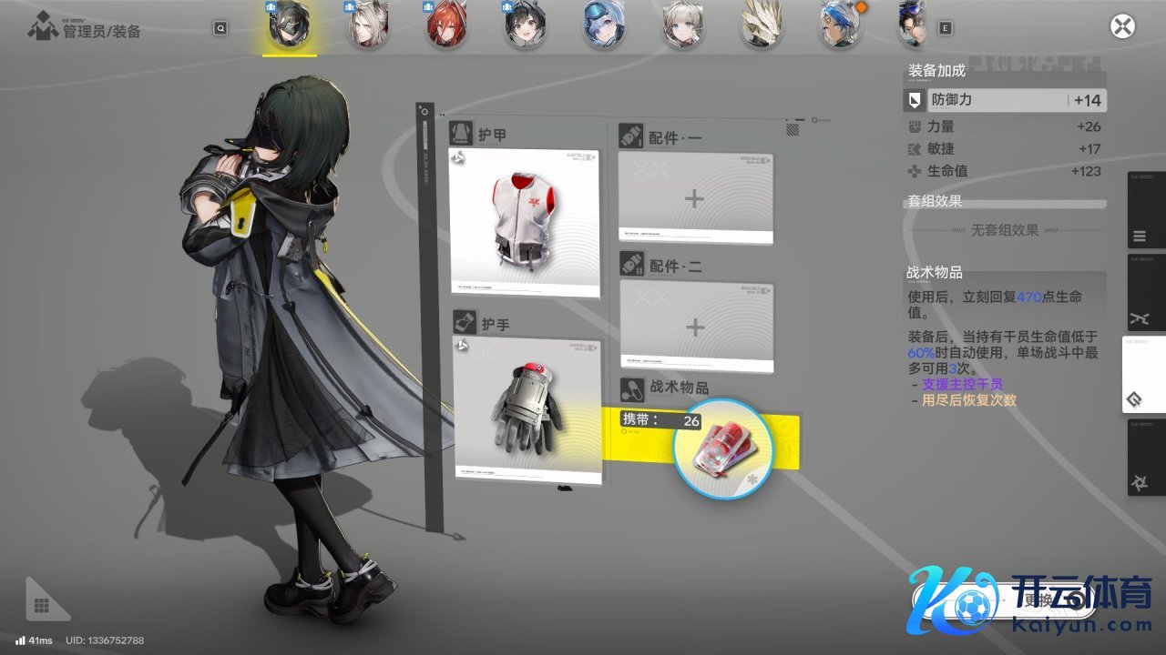 六,装备又名干员可佩戴四件装备,一个护甲,一个护手,两个配件。其中一个套装恶果需要3件套,是以养成也等于3+1。此外,还能佩戴一个战术物品,也等于食品或者药剂,主要作用是在战斗中自动回血