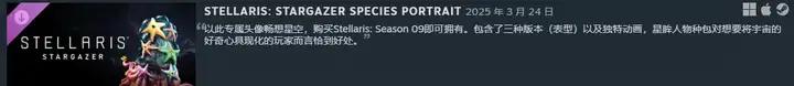 在此基础上,购买了《群星》第九季拓展通行证(Stellaris: Season 09)可免费取得虚境幽影访谒权限。第九季拓展通行证是玩家通向六合演化、灵能秘辛和天启真金不怕火狱的年票。该扩展票将坐窝解锁专属“不雅星者物种头像”并带来包含“万物竞发”“虚境幽影”“真金不怕火狱种族包”在内的三个主要游戏DLC。
