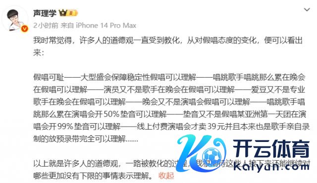 适度细密发稿本日,@声理学 还在微博执续发表认识,眼瞅着也曾从专家对假唱容忍度的变化,高潮到许多东谈主谈德不雅被教育的历程了 ……