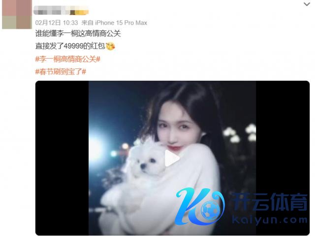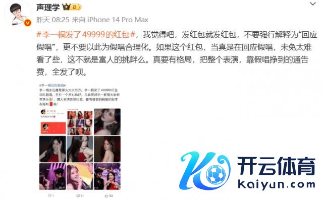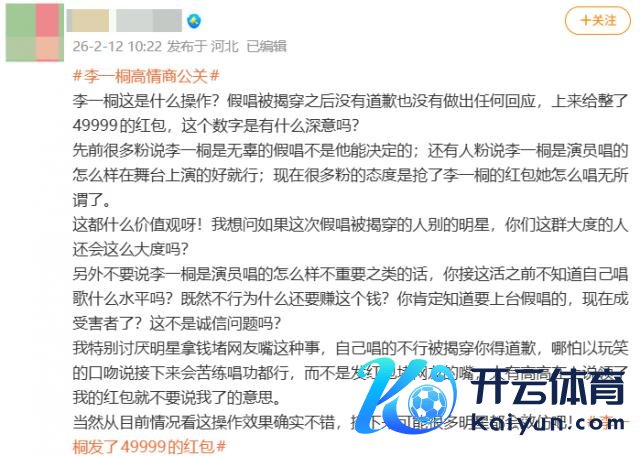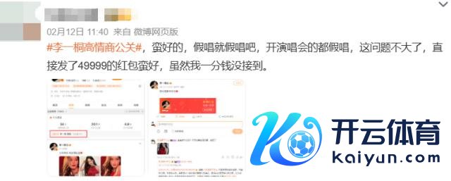 因为李一桐发红包后的配文是"小年兴盛,快去领红包",并莫得提到假唱事件,严格来说也不算谨慎回复。红包总金额 49999,有粉丝解释这是"四季久久"的谐音,但也有东谈主猜姐没发更多,是因为微博最多只可发 5w。